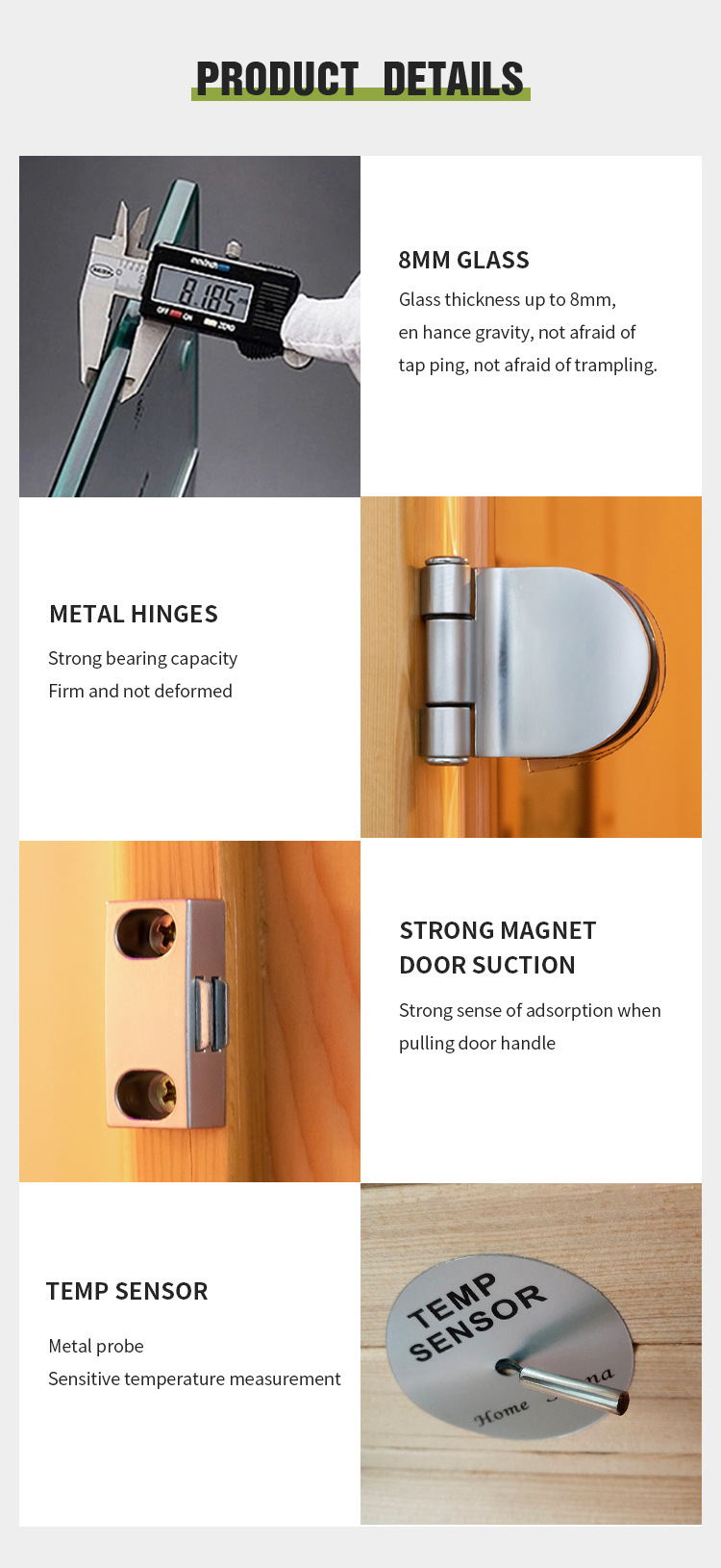Robuste metalhængsler: Metalhængslerne på 1-3 personers træ-infrarøde og dampsaunarum har en stærk bæreevne, hvilket sikrer, at de er faste og ikke-deforme. De giver pålidelig støtte til saunarummets struktur og garanterer langsigtet stabilitet.