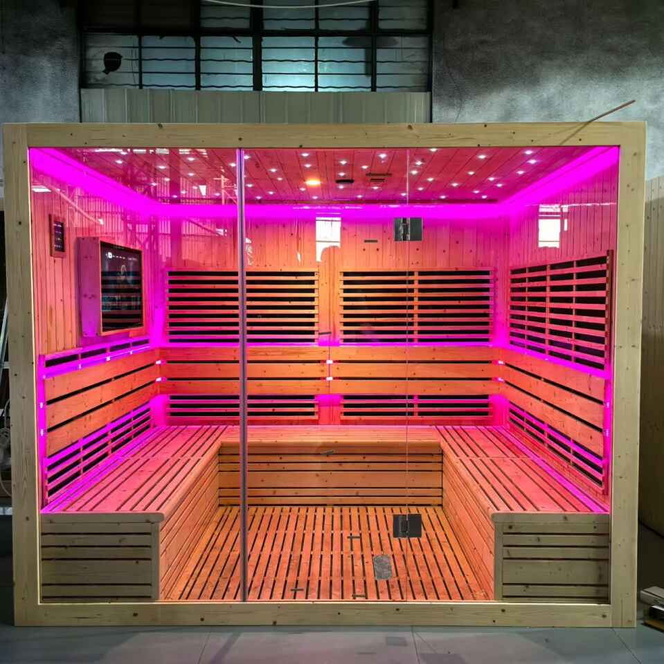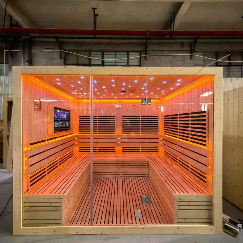 Invester i et saunarum, der omdefinerer gruppe-wellness. Vores 5-10 personers sauna træ-lang-infrarød saunarum med LCD-tv er mere end et produkt – det er et knudepunkt for afslapning, sundhed og samvær. Kontakt os i dag for at udforske tilpasningsmuligheder og bringe denne førsteklasses wellness-løsning til dit rum.