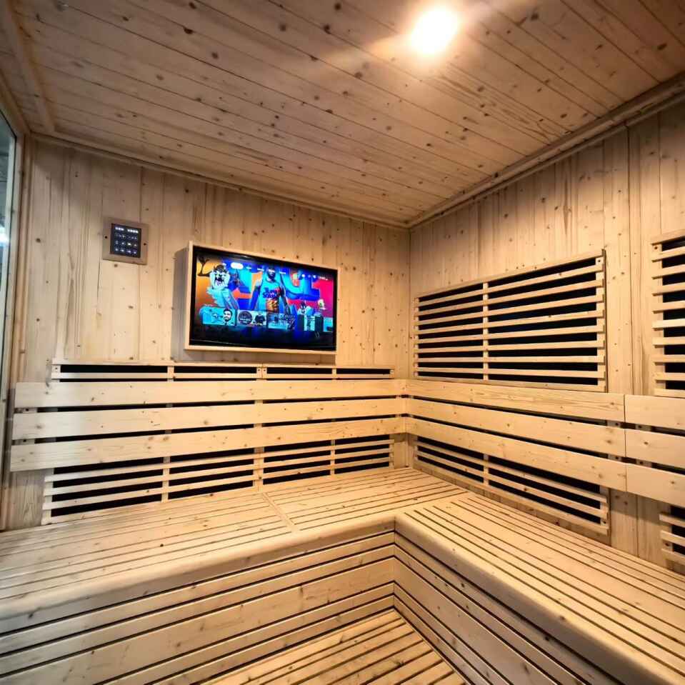 Det indbyggede LCD-TV (synligt på billedet) forvandler saunaoplevelsen:
