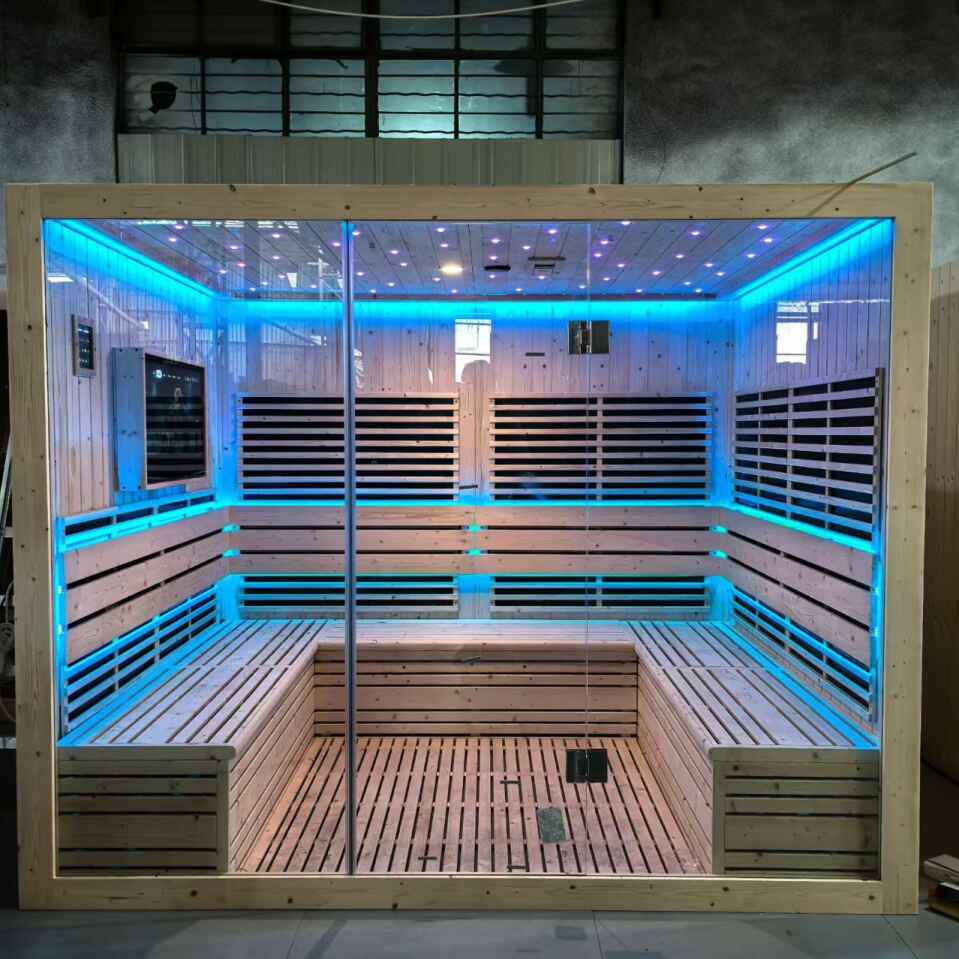Dette saunarum er udviklet til 5-10 brugere og er ideelt til familiesammenkomster, vennesammenkomster eller små kommercielle rum som spabade og wellnesscentre. Konstrueret med saunatræ af høj kvalitet sikrer den holdbarhed, samtidig med at den bringer en naturlig, varm æstetik til dit rum.